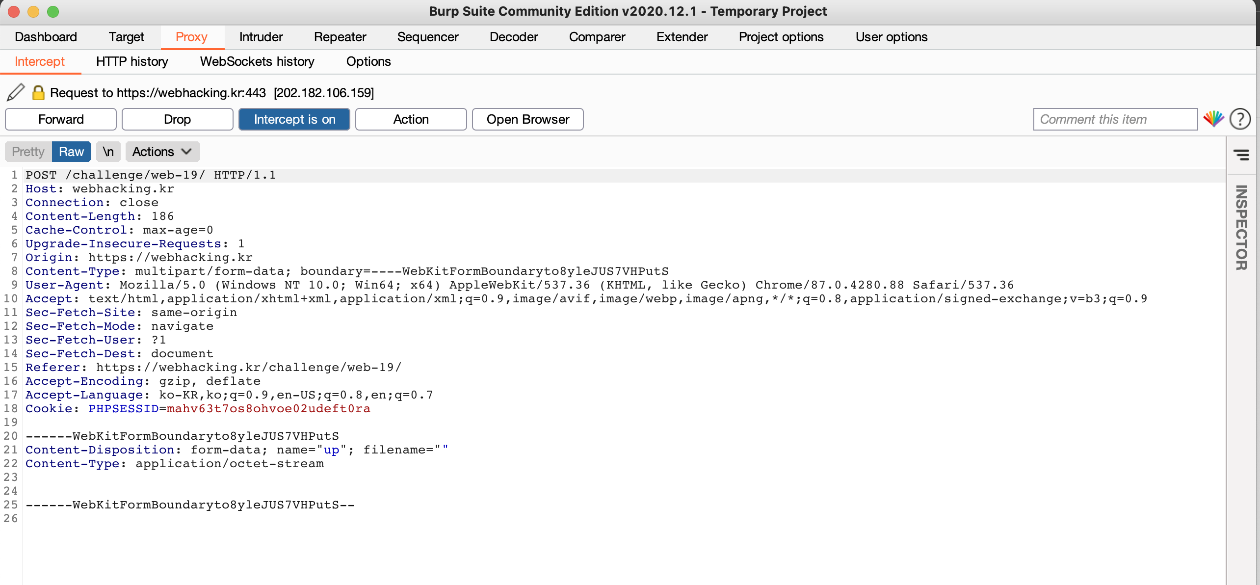 한번 버프스위트를 켜고 upload 요청을 인터셉트 해보자!